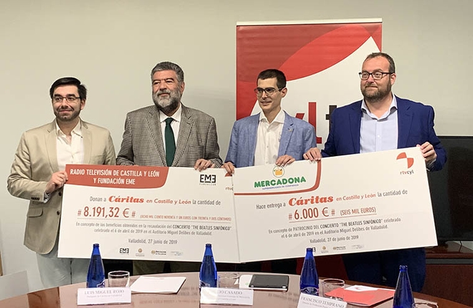 Radio Televisión de Castilla y León (RTVCyL) y Mercadona han entregado a Cáritas Castilla y León 14.191 euros, en concepto del desarrollo del concierto de carácter benéfico ‘The Beatles Sinfónico”. La televisión autonómica ha aportado un cheque de 8.191 euros, importe de la recaudación lograda con la venta de entradas, y Mercadona, por su parte, ha realizado una donación de 6.000 euros. A lo largo de los once años que lleva celebrándose este evento solidario se han obtenido más de 100.000 €. La recaudación se destinará a acciones en toda Castilla y León.