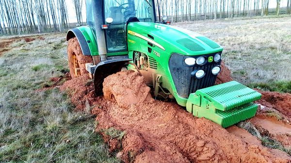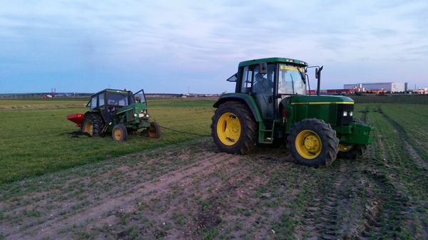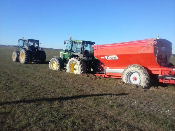 Goyo tirando abono se quedó atoyado, y Jesús Ángel consiguió sacarlo. Matilla de los Caños, Valladolid