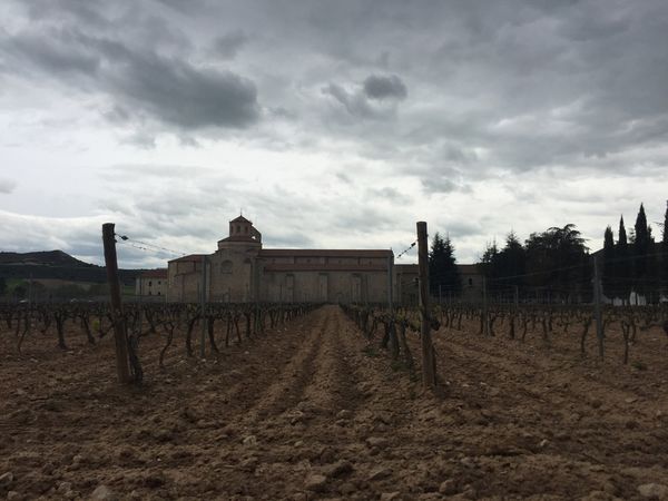 Viñas, cielo nuboso y el Monasterio de Valbuena. San Bernardo, Valladolid