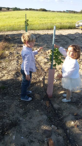 Mario y Sofía observando como crecen los pistachos. Horcajo de las Torres, Ávila