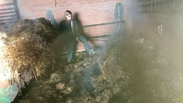 Limpiando estiércol en la nave. Salía humo porque estaba cociendo. Pino del Río, Palencia