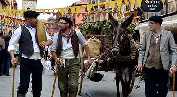 Fiesta de la Vendimia. Una burra zamorano -leonesa tirando de un carro marbano repleto de uvas y viandas. Toro, Zamora.