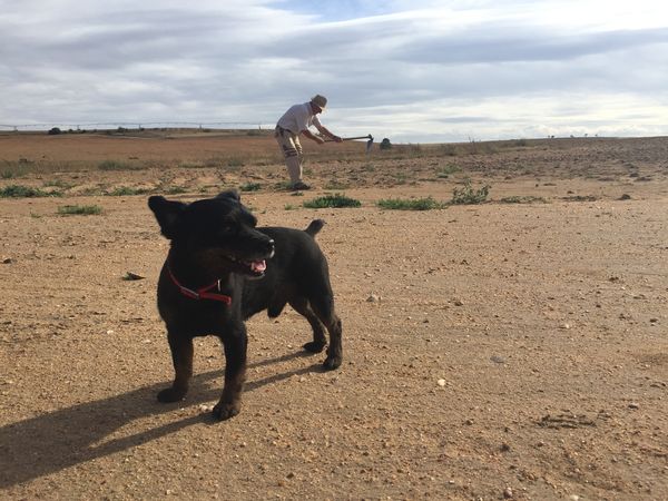 Su padre Jaima y Chicho el perro quitando mala hierba para empezar a arar. Castronuño, Valladolid