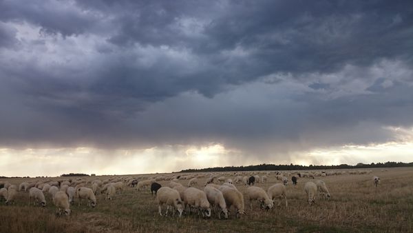 Ovejas a punto de ser pilladas por la tormenta. Pino del Río, Palencia.