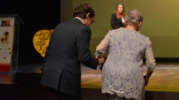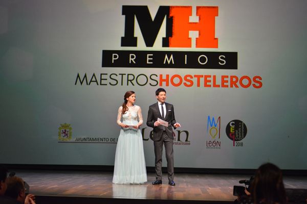 Alfonso Fernández Mañueco, alcalde de Salamanca, acompaña al escenario a Paulina Andrés para hacerle entrega del Premio Especial Maestros Hosteleros 2018.