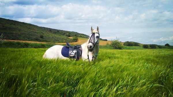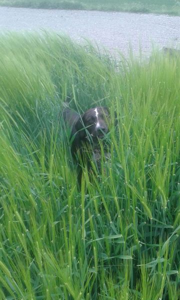 Su ayudante Amore jugando entre la cebada espigada. Velliza, Valladolid