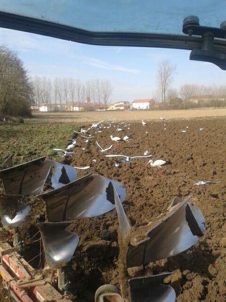 Arando rodeado de cigüeñas. San Martín del Obispo, Palencia
