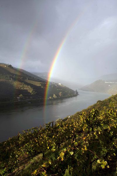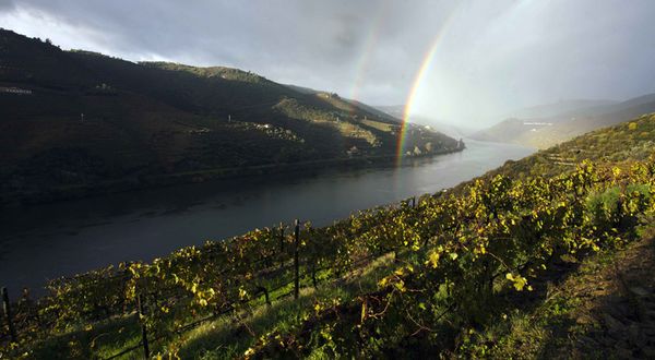 Vista del río Duero atravesado por dos arcoíris junto a los viñedos de Quinta Nova de Nossa Senhora do Carmo en Pinhao