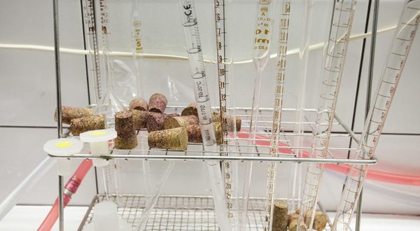Corchos junto a pipetas en el laboratorio de la Quinta do Pessegueiro del inversor francés Roger Zannier