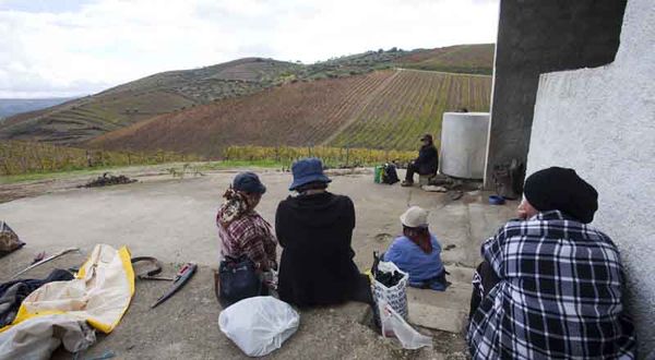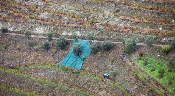 Trabajadores vareando olivos junto a las viñas de la Quinta de Foz Torto en Pinhao