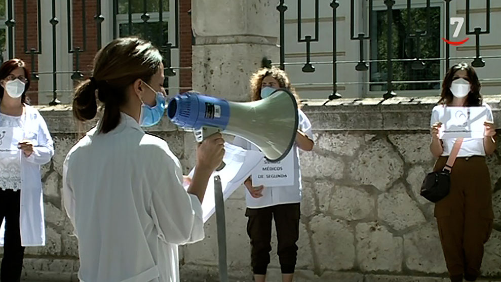 La veintena de manifestantes concentrados en la plaza de Zorrila realizó un paseo hasta la sede de Consejería de Sanidad durante el que portó pancartas con mensajes en favor de una mejor atención sanitaria y un sistema de contratación justo.