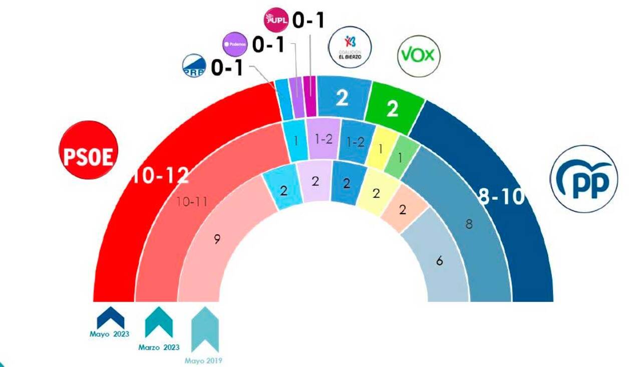 La evolución de estimación de voto atendiendo a los datos del sondeo de Sigma Dos para CyLTV del pasado mes de marzo refleja un crecimiento del PSOE en un concejal. El PP también aumentaría ganando dos en el mejor de los casos. Verían reducida su representación Podemos y el Partido Regionalista de El Bierzo y USE, que desaparecería. Vox y Coalición por El Bierzo saldrían reforzados, así como UPL. Ciudadanos confirmaría su salida del Ayuntamiento.