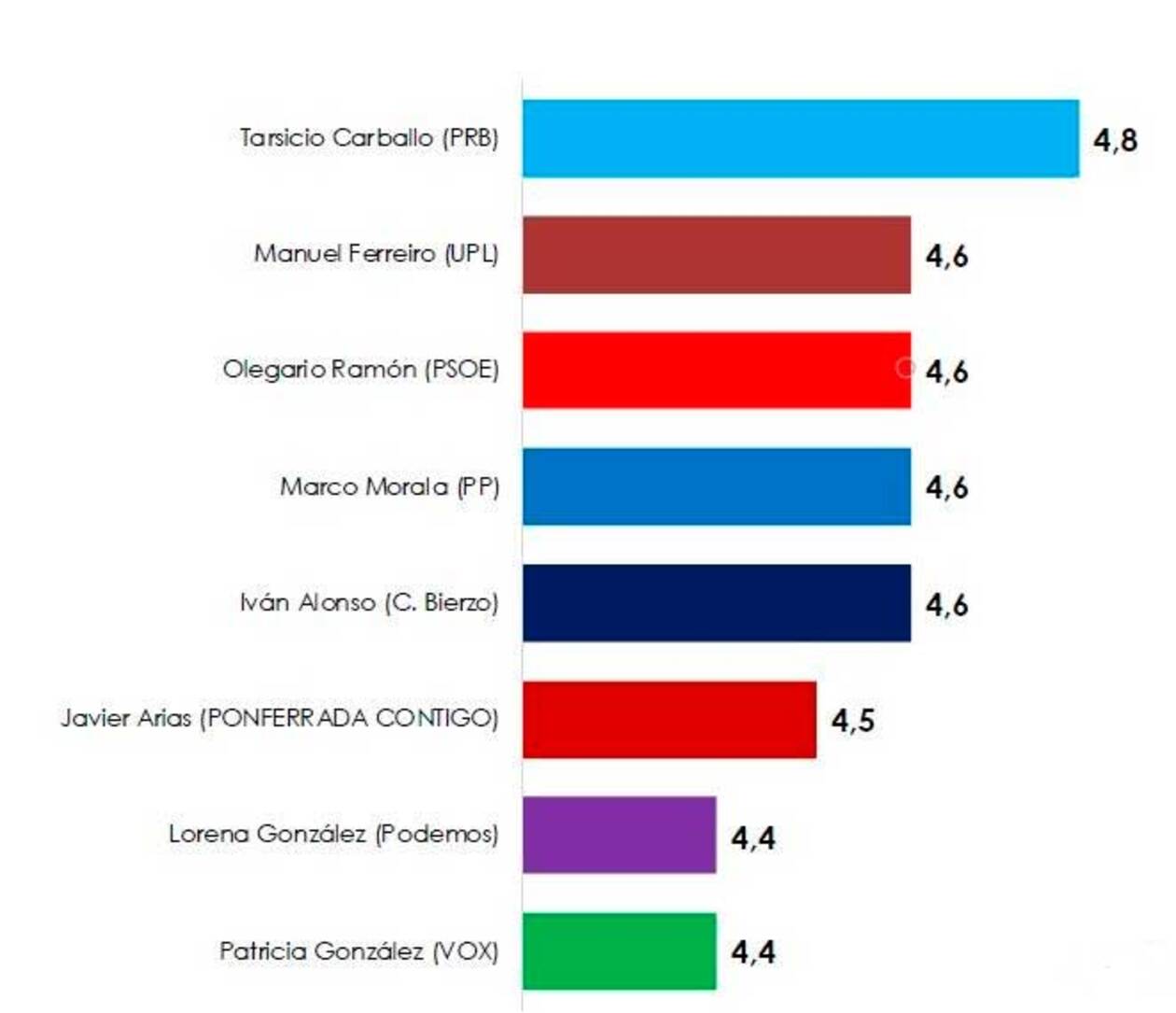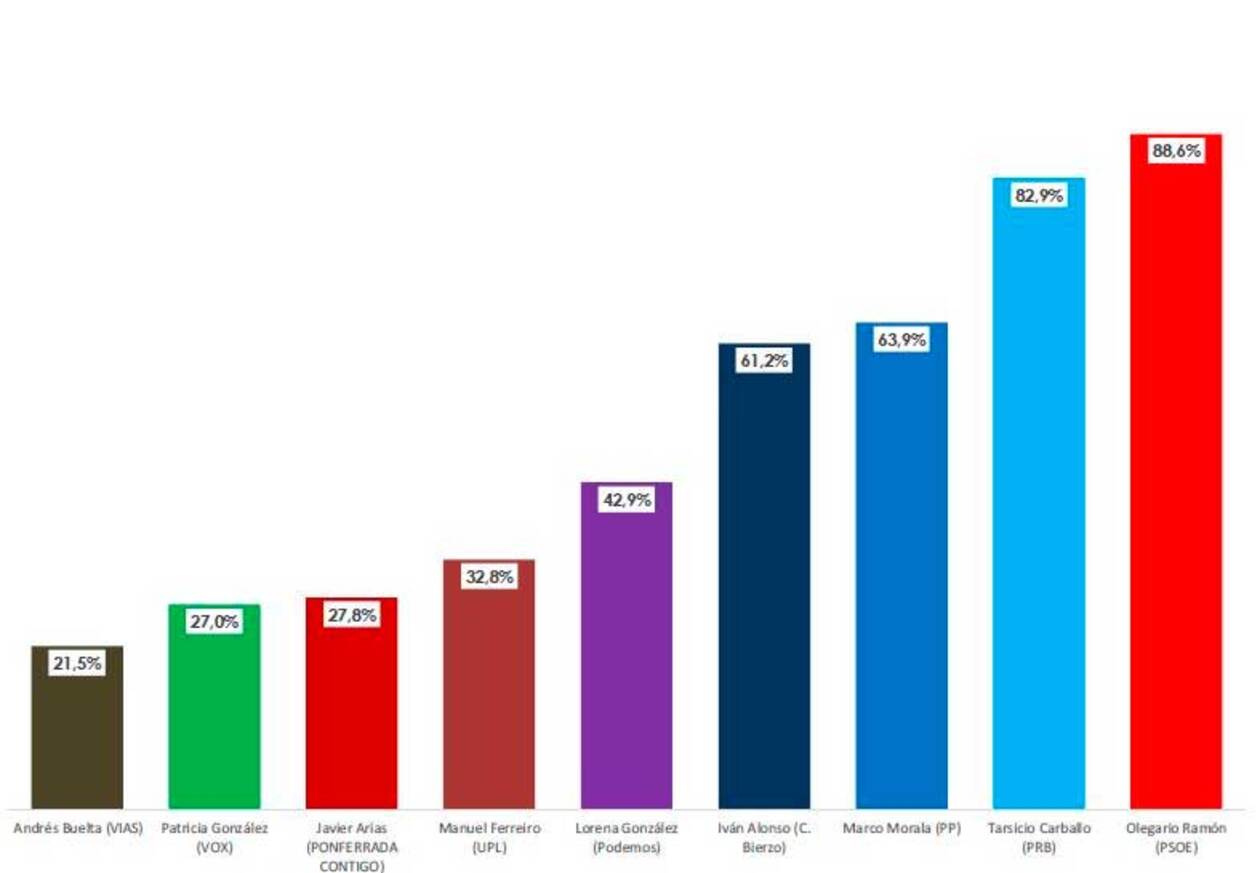 O legario Ramón (PSOE), actual alcalde de Ponferrada, es el líder político con mayor grado de conocimiento con el 88,6%, seguido de Tarsicio Carballo (PRB) con el 82,0%. Marco Morala (PP) tiene una notoriedad del 63,9%, seguido de Iván Alonso, de Coalición por el Bierzo (61,2%), en tercera posición.