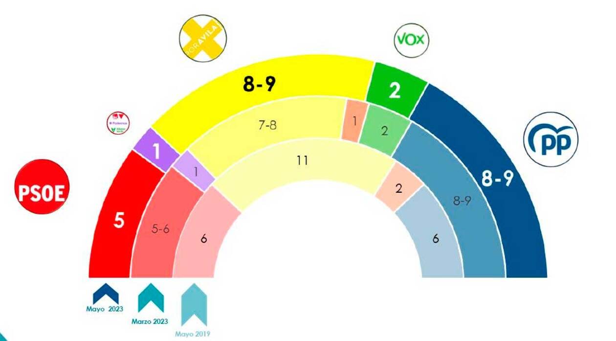 Transcurridos dos meses, Por Ávila ganaría un representante; por su parte el PSOE se mantendría, perdiendo el que le otorgaba su mejor horquilla, y Cs perdería el de marzo.