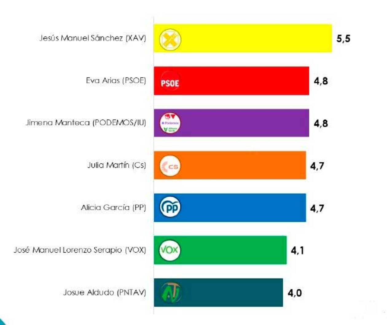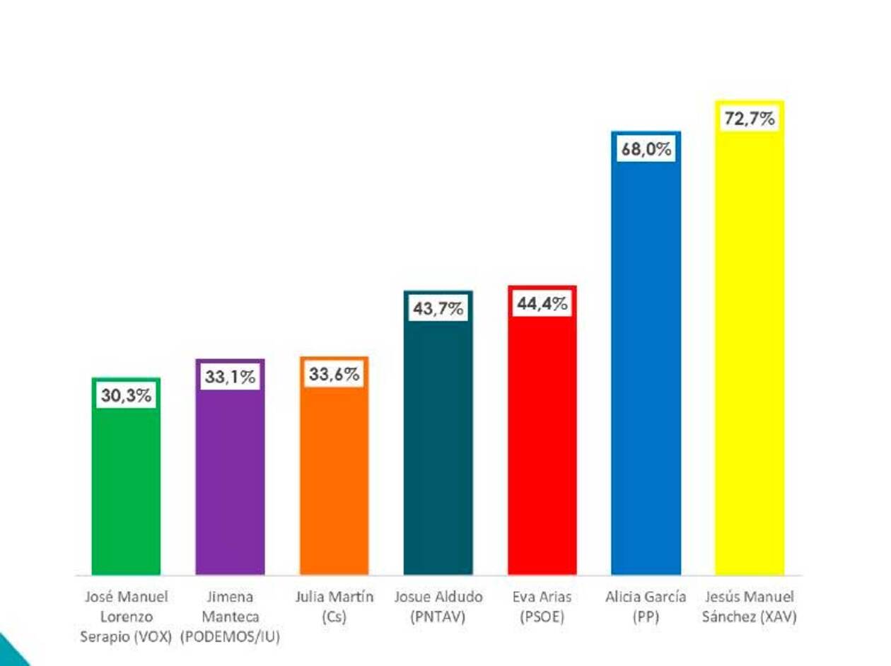 El grado de conocimiento del resto de candidatos a la Alcaldía está por debajo del cincuenta por ciento. Eva Arias, del PSOE, ocupa la tercera posición en valoración, con un 44,4%, seguida de Josue Aldudo, de PNTAV, con un 43,7%. Por debajo del treinta por ciento se sitúan Julia Martín, de Ciudadanos, con un 33,6%, Jimena Manteca, de Podemos-IU, con un 33,1% y José Manuel Lorenzo Serapio, de Vox, con un 33,3%.