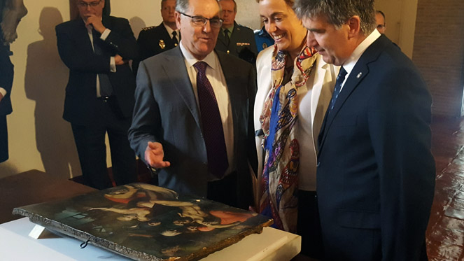 Ignacio Cosidó, director general de la Policía y agentes de la Brigada de Patrimonio Histórico de la Policía Nacional han entregado este lunes a la Diócesis Palentina, concretamente a la iglesia de la localidad palentina de Lantadilla, la tabla 'Lamento ante el cuerpo de Cristo'. El óleo sobre madera que data del siglo XVI, cuya autoría es atribuida al círculo del escultor y pintor castellano Alonso Berruguete, hijo del pintor Pedro Berruguete, fue intervenido el pasado año en una sala de subastas de Madrid. La pintura ha sido entregada al delegado Diocesano del Patrimonio Cultural de Palencia, Jose Luis Calvo Calleja, en un acto al que también han asistido el subdelegado del Gobierno y varias autoridades locales.