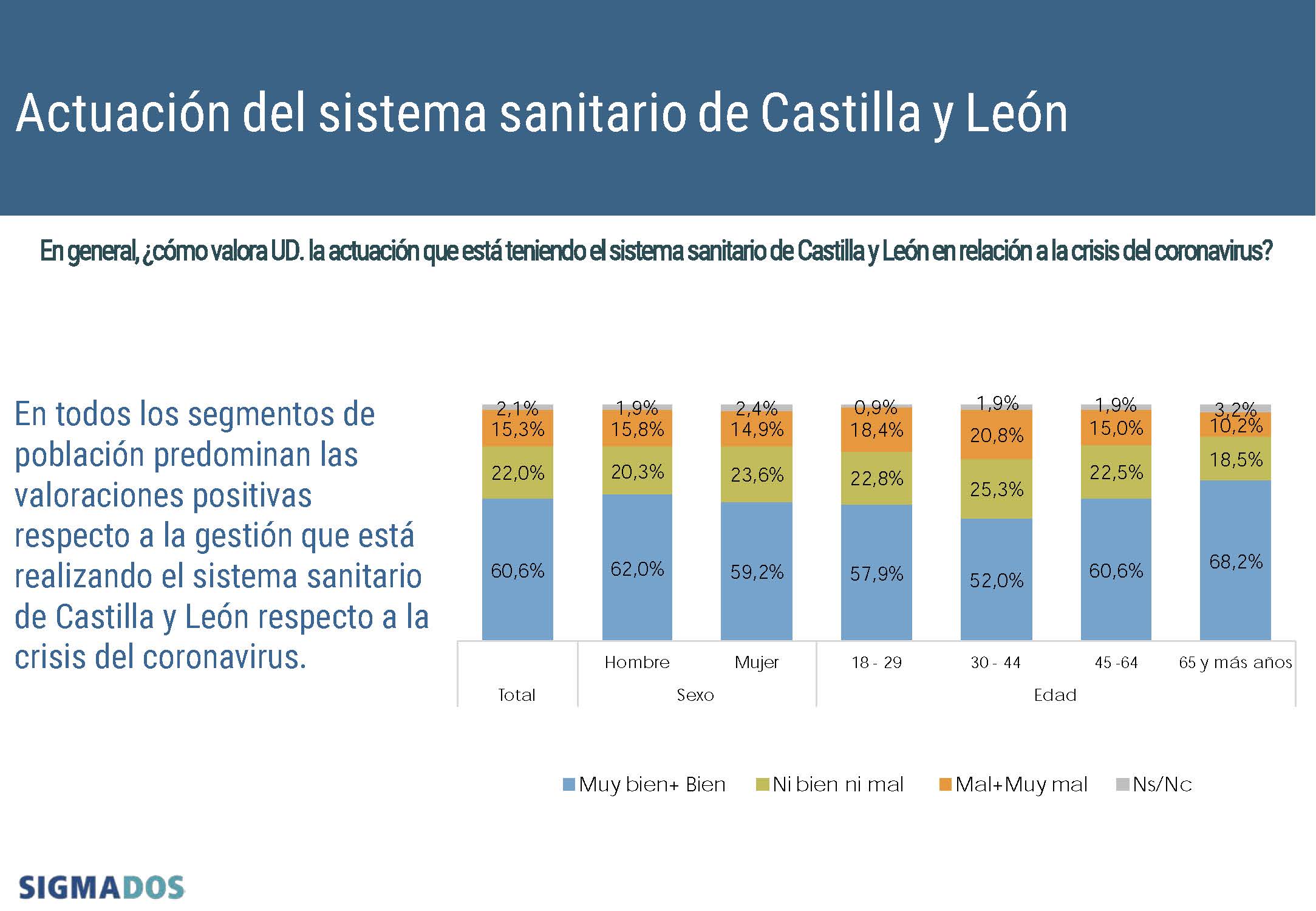 Las impresiones positivas predominan en todos los segmentos de población tanto por sexo como por edad. El 59,2% de las mujeres estima que la actuación es buena o muy buena, opinión que comparten el 62% de los hombres. Por franjas de edad son los mayores de 65 años quienes tienen la mejor impresión, positiva para el 68,2%. El siguiente segmento que más aplaude la actuación es el de la población entre 45 y 64 años, puesto que el 60,6% opina que es buena o muy buena, seguido de los menores de 30 años, (57,9%) y la población entre 30 y 44 años (52%).