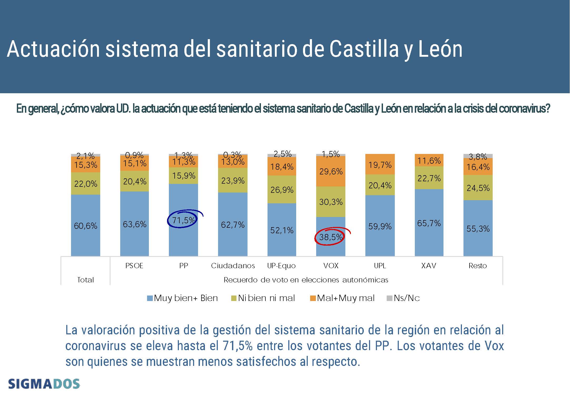 En el conjunto del electorado, en todos los bloques la valoración es positiva, con los votantes de VOX como el colectivo menos satisfecho (38,5%). Los votantes del PP son quienes tienen la opinión más favorable, puesto que el 71,5% estima que la actuación es positiva, seguidos de los votantes de XAV (65,7%), los partidarios del PSOE (63,6%), Ciudadanos (62,7%), UPL (59,9%) y UP-Equo (52,1%).