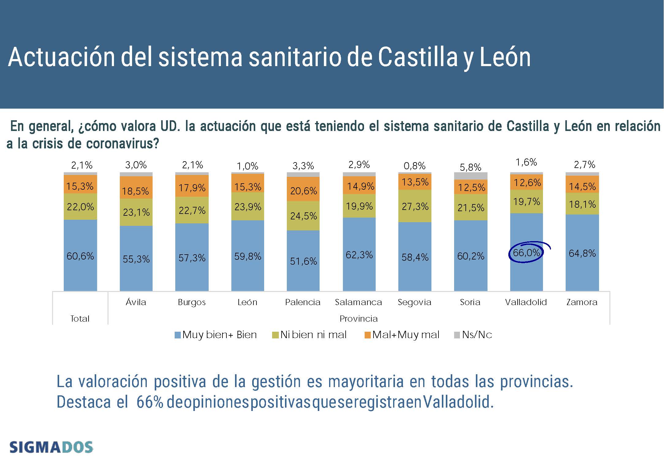 Por provincias, en todas los datos son favorables. Destaca el 66% de opiniones positivas registradas en Valladolid, seguido de Zamora (64,8%), Salamanca (62,3%) y Soria (60,2%). Por debajo del sesenta por ciento se sitúan León (59,8%), Segovia (58,4%), Burgos (57,3%), Ávila (55,3%) y Palencia (51,6%).
