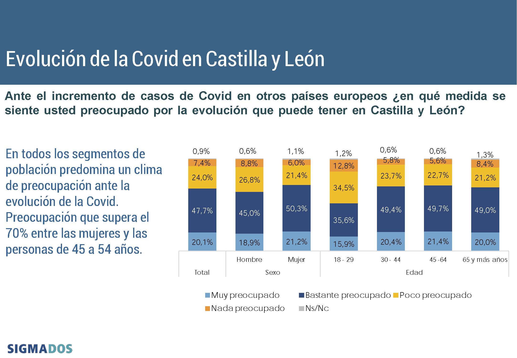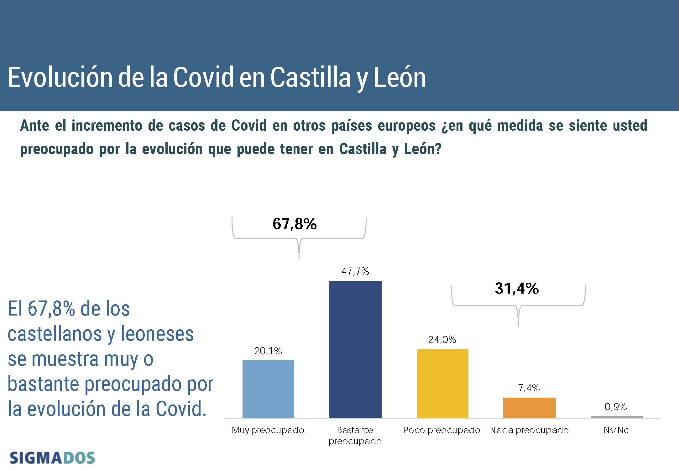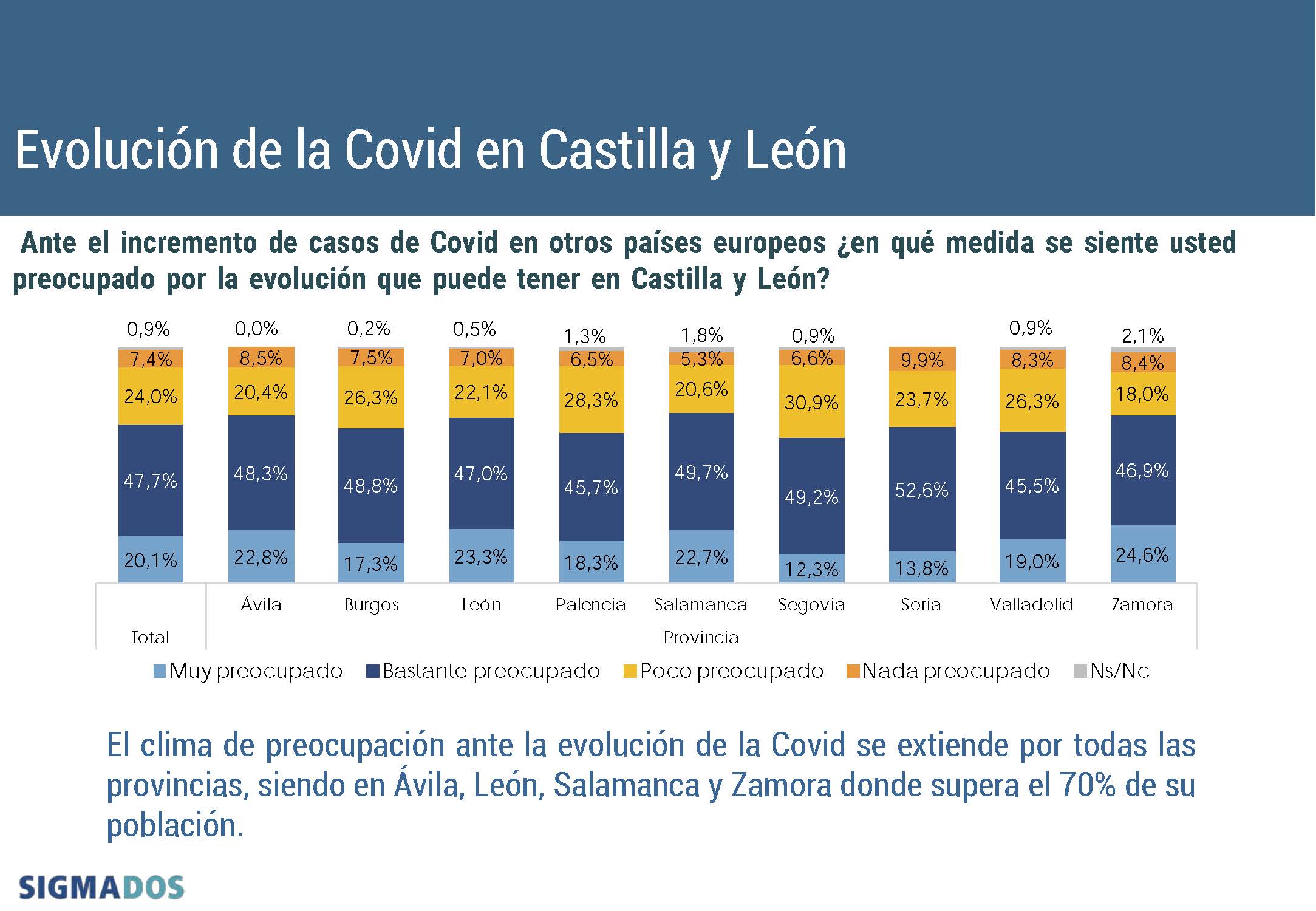 A nivel provincial la opinión de bastante o mucha preocupación ante la evolución de la pandemia es común en las nueve, superando el 70% en Salamanca (72,4%), Zamora (71,5%), Ávila (71,1%) y León (70,3%). La percepción es similar para el 66,1% de los burgaleses, el 66,4% de los sorianos, el 64,5% de los vallisoletanos, el 64% de los palentinos y el 61,5% de los segovianos.