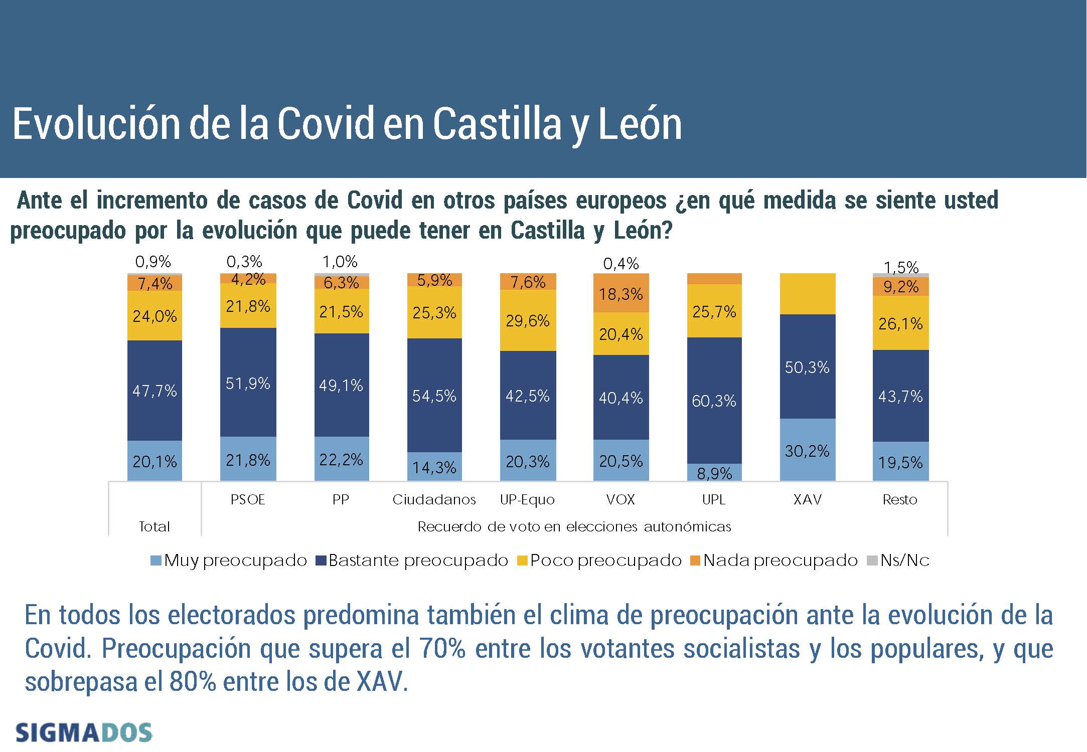 En todos los electorados predomina también la percepción de preocupación ante la evolución de la Covid viendo la situación en otros países europeos. Sobrepasa el 80% entre los partidarios de XAV (80,5%) y supera el 70% entre los votantes socialistas (73,7%) y los populares (71,3%). Para el 69,2% de los simpatizantes de UPL y el 68,8 de los partidarios de Ciudadanos la preocupación también es alta o muy alta. Este clima se extiende menos entre los votantes de VOX (60,9%) y UP-Equo (62,8%).