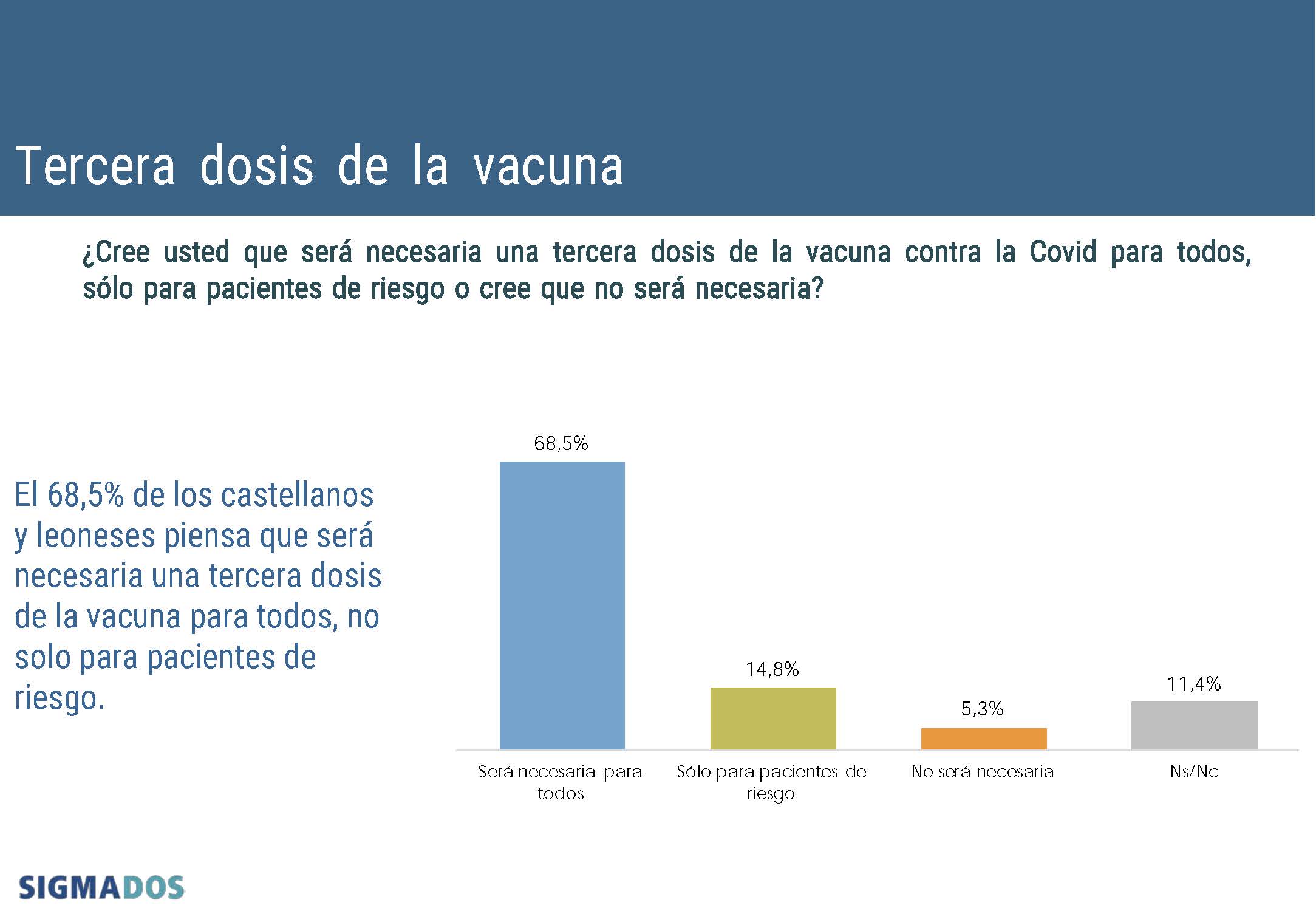 El 68,5% de los castellanos y leoneses opina que será necesaria una tercera dosis de la vacuna contra el coronavirus para la población en general, frente al 14,8% que estima que la dosis de refuerzo debería inocularse solo a los pacientes de riesgo, tal y como se desprende del barómetro de Sigma Dos para CyLTV coincidiendo con el cierre de 2021.