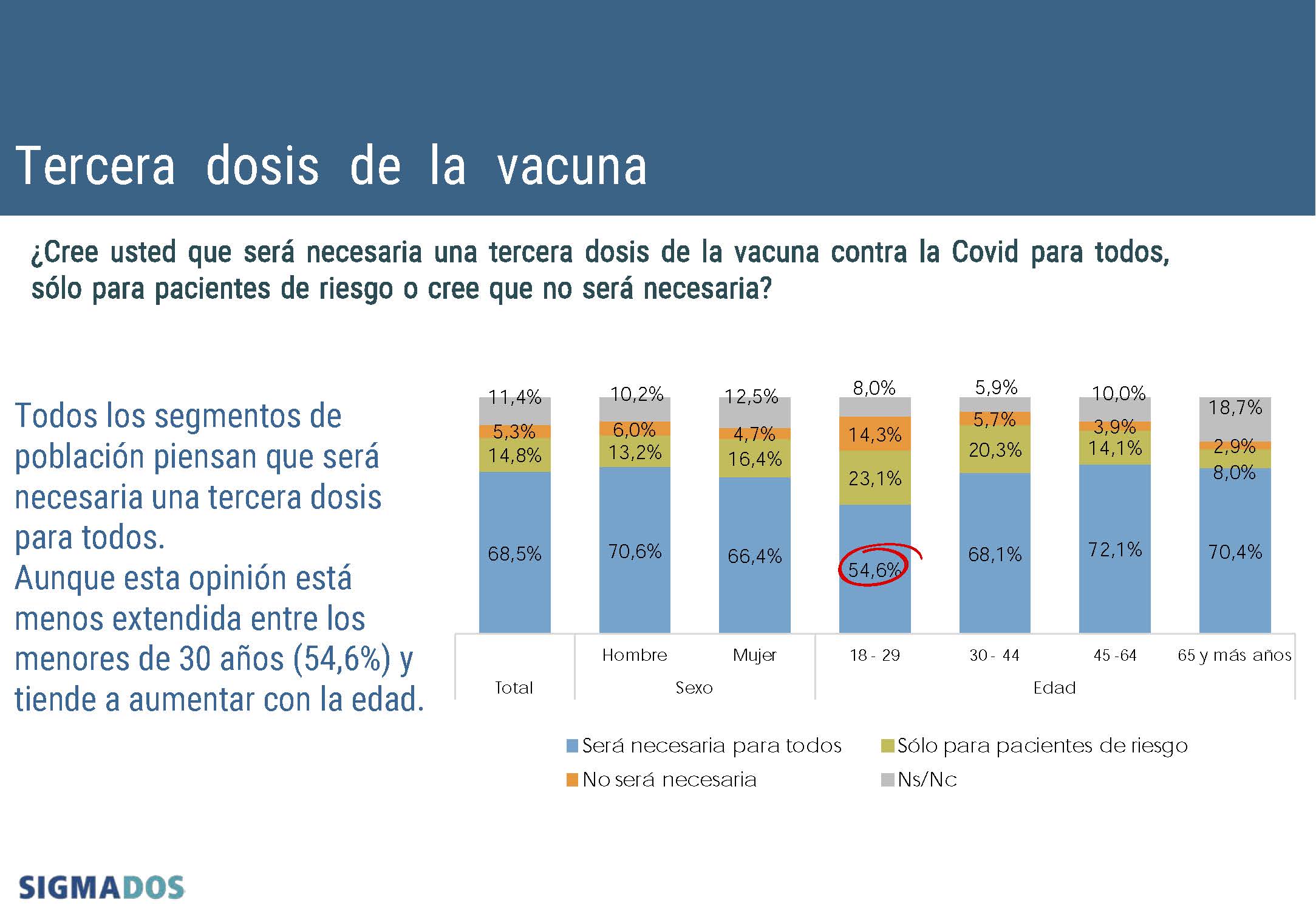 En lo que respecta al segmento poblacional por sexo, los hombres (70,6%) perciben más necesaria la profilaxis de refuerzo que las mujeres (66,4%).