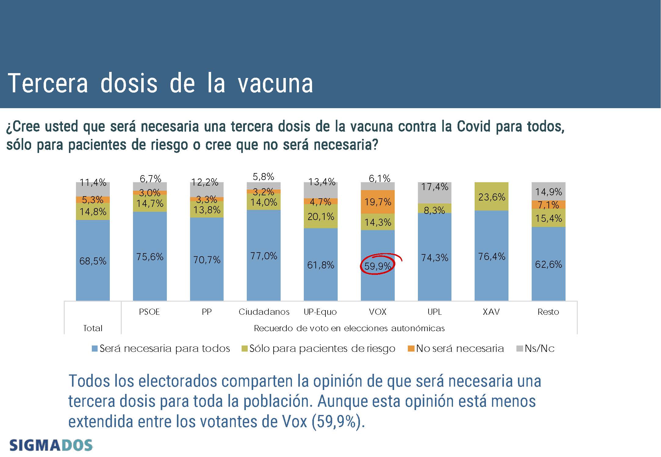 En lo que se refiere al conjunto del electorado, todos los votantes comparten la opinión de la necesidad de una tercera dosis para la población general, con datos por encima del setenta por ciento, salvo en el caso de los votantes de VOX, que se alejan más de esta percepción (59,9%), seguidos de los partidarios de UP-Equo (61,8%). La opinión favorable a una dosis de refuerzo es compartida por el 77% de los votantes de Ciudadanos, el 76,4% de los de XAV, el 75,6% de los partidarios del PSOE, el 74,3% de los simpatizantes de UPL y el 70,7 de los electores del PP.