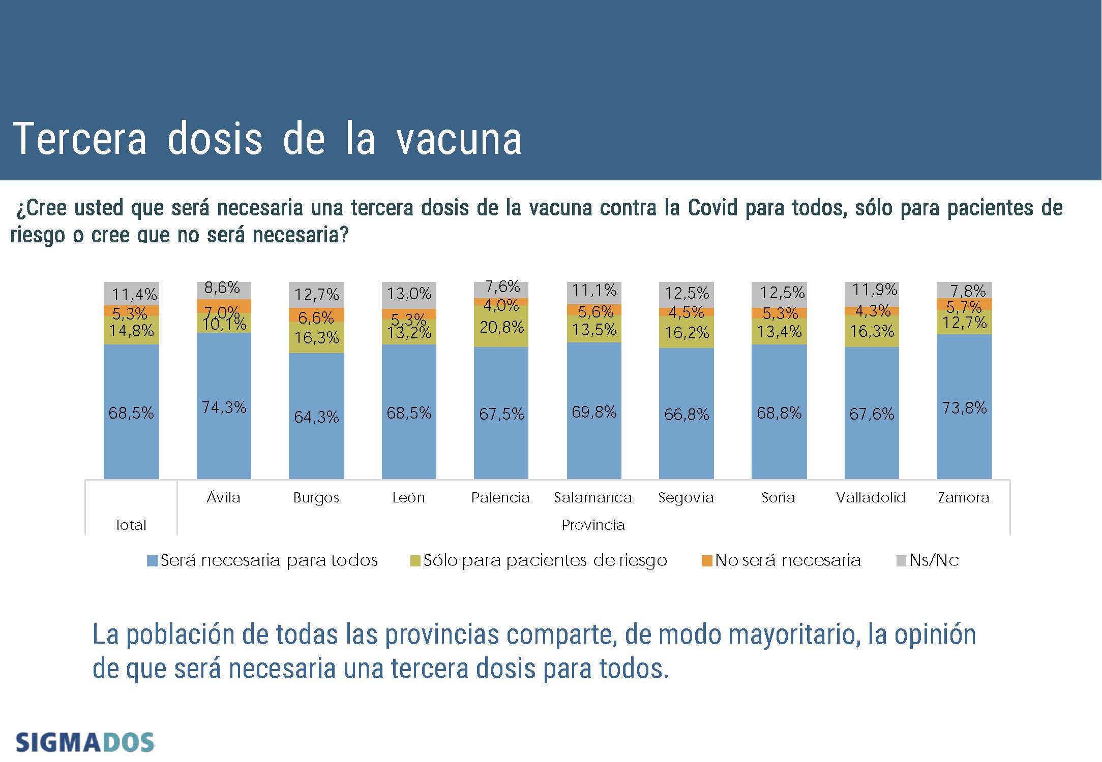 La población de las nueve provincias de la comunidad comparte mayoritariamente la opinión de que será necesaria una tercera dosis para todos. El listado en esta línea lo encabezan con datos por encima del setenta por ciento Ávila (74,3%) y Zamora (73,8%), seguidas de Salamanca (69,8%), Soria (68,8%), León (68,5%), Valladolid (67,6%), Palencia (67,5%), Segovia (66,8%) y Burgos (64,3%).