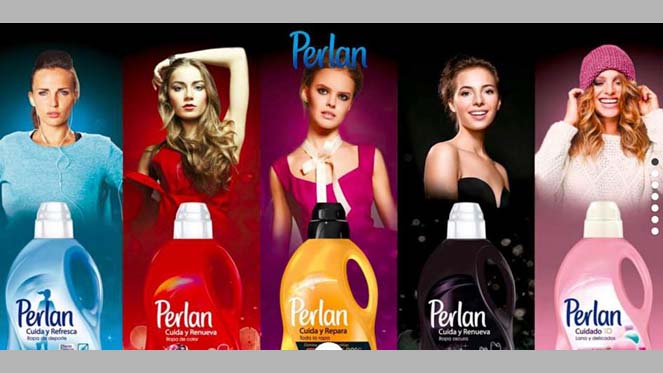 Para anunciar el modelo 'Perlan Cuida y Protege' utiliza la imagen de dos mujeres, una con un vestido rojo (para el producto pensado para la ropa de color) y otra que viste de negro (para el detergente destinado a la ropa oscura). Mientras, el 'Perlan Cuidado 3D', para ropa delicada, se acompaña con la imagen de una mujer con ropa de lana, y el detergente 'Perlan Cuida y Repara', que elimina, según la publicidad, pelusas y bolitas de la ropa, también se acompaña en esta campaña con la imagen de una mujer.