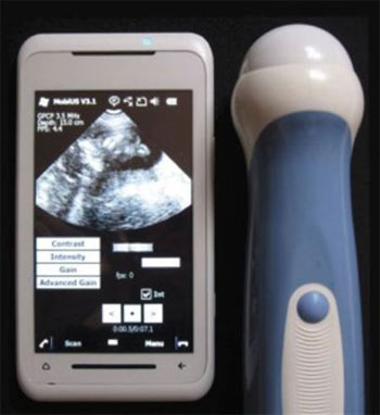 Este novedoso aparato consta de un móvil de la marca Toshiba con Windows Mobile conectado a una sonda de ultrasonido que posibilita la realización de imágenes por ultrasonido, en las que se puede ver, entre otras cosas, la cara del futuro bebé.