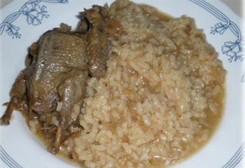 Una vez cocido, añadimos el arroz. La cantidad debe ser algo superior a la cantidad de agua. Se deja cocer durante unos veinte minutos y se añade sal.
