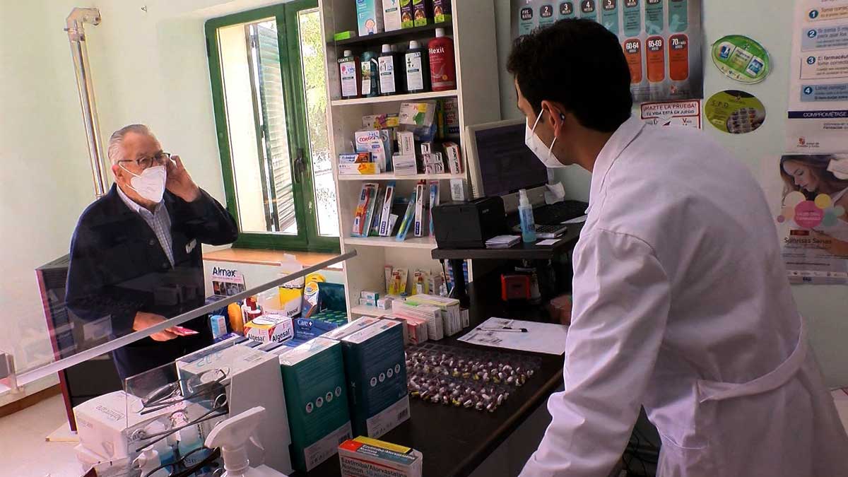 Álvaro es el farmacéutico de Los Rábanos desde hace ya once años. Tener abierta esta puerta es importante para usuarios como José Luis Gómez Eras que acude muy a menudo.