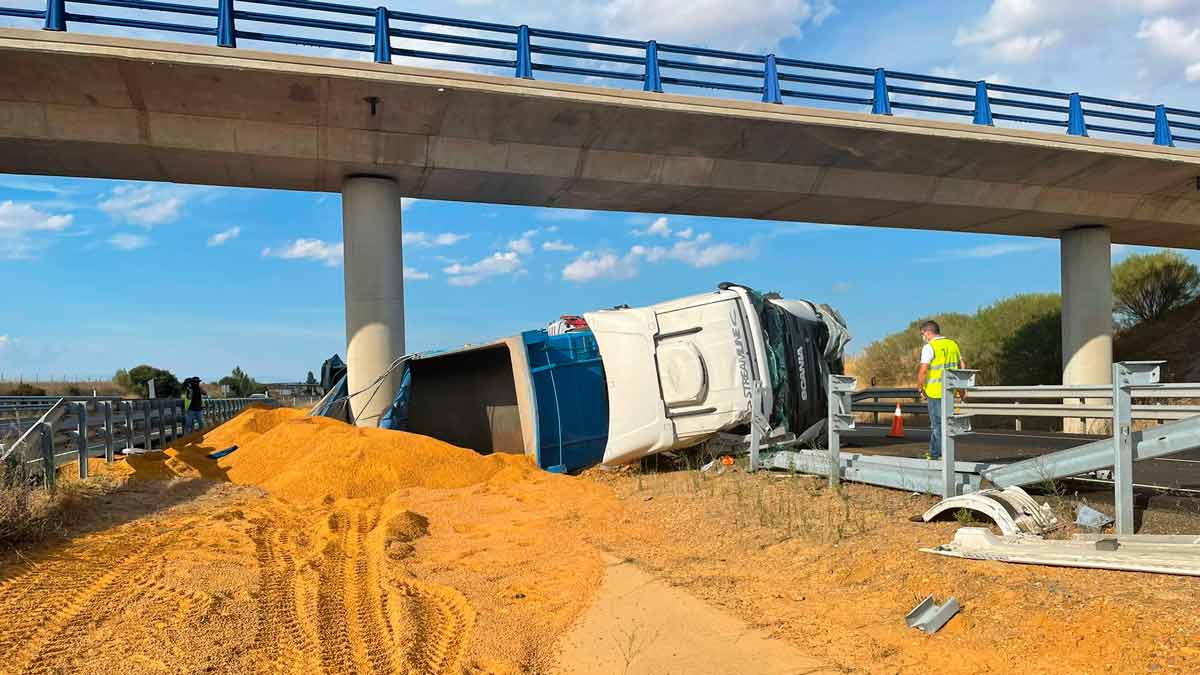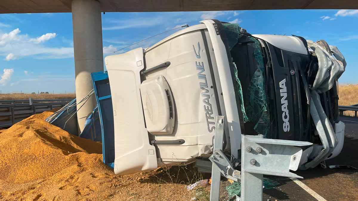 La salida de vía de un camión, que ha quedado volcado en la mediana, a la altura del kilómetro 70 de la autovía A-67, sentido Cantabria, dentro del término municipal de Santa Cruz de Boedo, en Palencia, ha obligado a cortar un carril de la vía, aunque ya se ha reabierto.