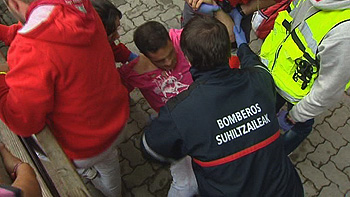 Los heridos por traumatismos son cuatro varones. Un joven de entre 18 y 25 años, trasladado desde Santo Domingo, sufre lesión por caída en la pierna derecha y otro varón, también de entre 18 y 25 años, presenta lesión por caída en la pierna izquierda. Ha llegado al hospital desde la Curva de Estafeta.