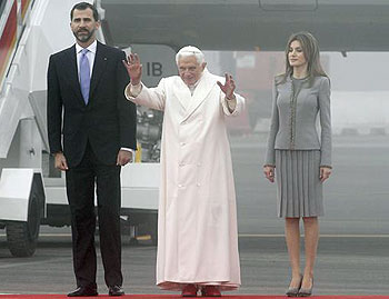 Su Alteza Real el Príncipe Felipe, que ha acudido junto a su esposa, doña Letizia, al Aeropuerto de Santiago a recibir al Papa Benedicto XVI, ha resaltado en sus palabras de bienvenida el "enorme aprecio" por el "compromiso" del Pontífice "con la paz, la libertad y la dignidad del ser humano".