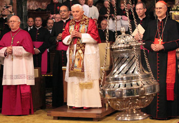 En la homilía, Bendicto XVI ha proclamado "la gloria del hombre" y ha advertido "de las amenazas a su dignidad por el expolio de sus valores y riqueza originarios, por la marginación o la muerte infligidas a los más débiles y pobres". "No se puede dar culto a Dios sin velar por el hombre su hijo y no se sirve al hombre sin preguntarse por quién es su padre y responderle a la pregunta por él", ha aseverado.