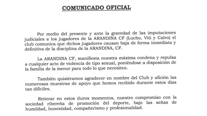 A tenor de los hechos, la Arandina Club de Fútbol ''ante la gravedad de las imputaciones judiciales de los jugadores'', detenidos y ahora en prisión, decidió ''causar baja de forma inmediata y definitiva'' a los mismos por su presunta implicación en un delito de contenido sexual que afecta a una menor.
