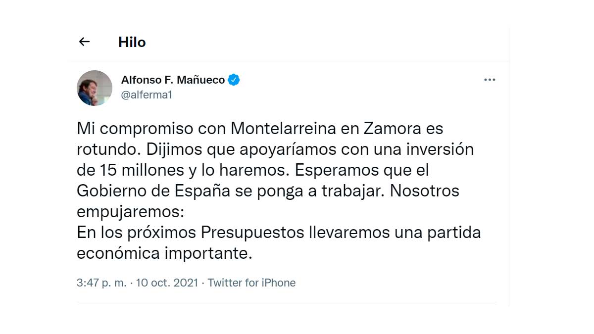Asimismo, en otro tuit, recogido por Ical, Mañueco deseó que el presidente Sánchez, "encuentre un hueco en su agenda para abordar este proyecto y otros muchos pendientes en Castilla y León". "Desde mi Gobierno seguiremos defendiendo el mejor futuro para nuestra tierra", concluyó.