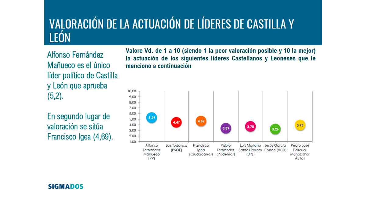 El presidente de la Junta y del Partido Popular en Castilla y León, Alfonso Fernández Mañueco, es el único líder político de la región al que los encuestados otorgan su aprobado. En una puntuación del 1 al 10 recibe un 5,29. En segundo lugar se sitúa el actual vicepresidente del Gobierno Autonómico Francisco Igea, con un 4,69. Le siguen el socialista Luis Tudanca, con un 4,47, Pablo Fernández de Podemos con un 3,39%, Luis Mariano Santos Rellero de UPL con un 3,70, Jesús García Conde, de Vox, con un 3,26 y Pedro José Pascual Muñoz de Por Ávila con un 3,95.