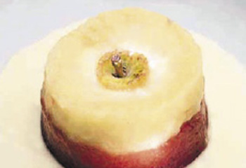 La forma idónea de presentación será utilizando unos aros metálicos para emplearlos como molde. Primero preparamos la cara interior del aro con láminas de membrillo, después se rellenarán con las reinetas y se salsea por el exterior con la reducción de la nata.