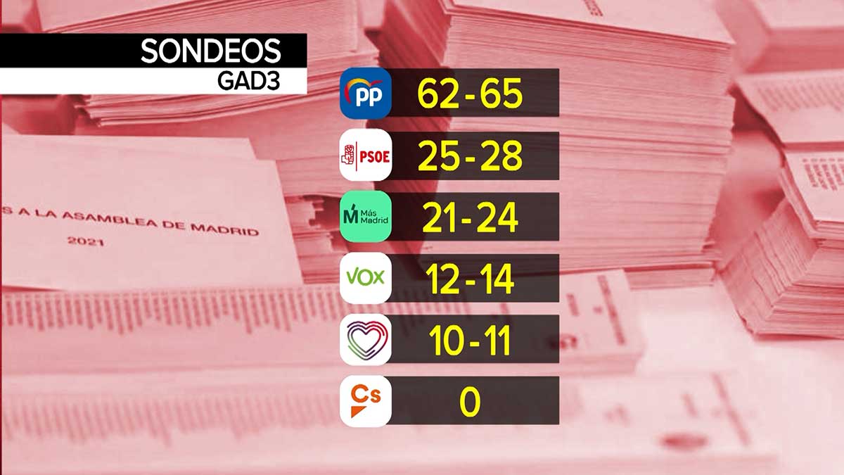 Por detrás, se sitúa Más Madrid, con 25 escaños y un 17,59% de los apoyos, seguido de Vox, con 12 diputados y 8,81% de los votos.