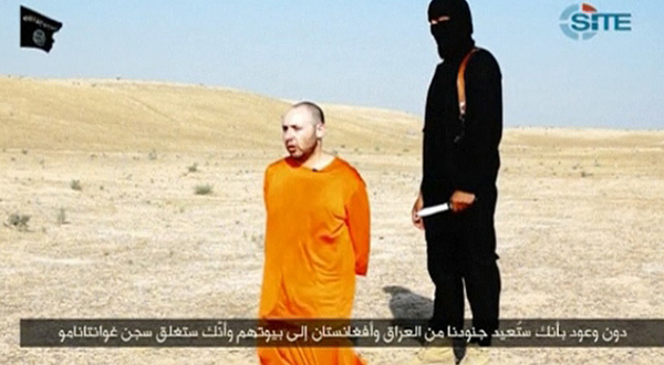 En el vídeo, titulado 'Un segundo mensaje para Estados Unidos', Sotloff aparece arrodillado, con las manos atadas a la espalda y vestido con una túnica naranja, similar a los uniformes que llevan los presos de la cárcel militar de Guantánamo. Junto a él, hay un miembro del Estado Islámico vestido de negro y encapuchado que le apunta con un cuchillo que finalmente utiliza para decapitarle.