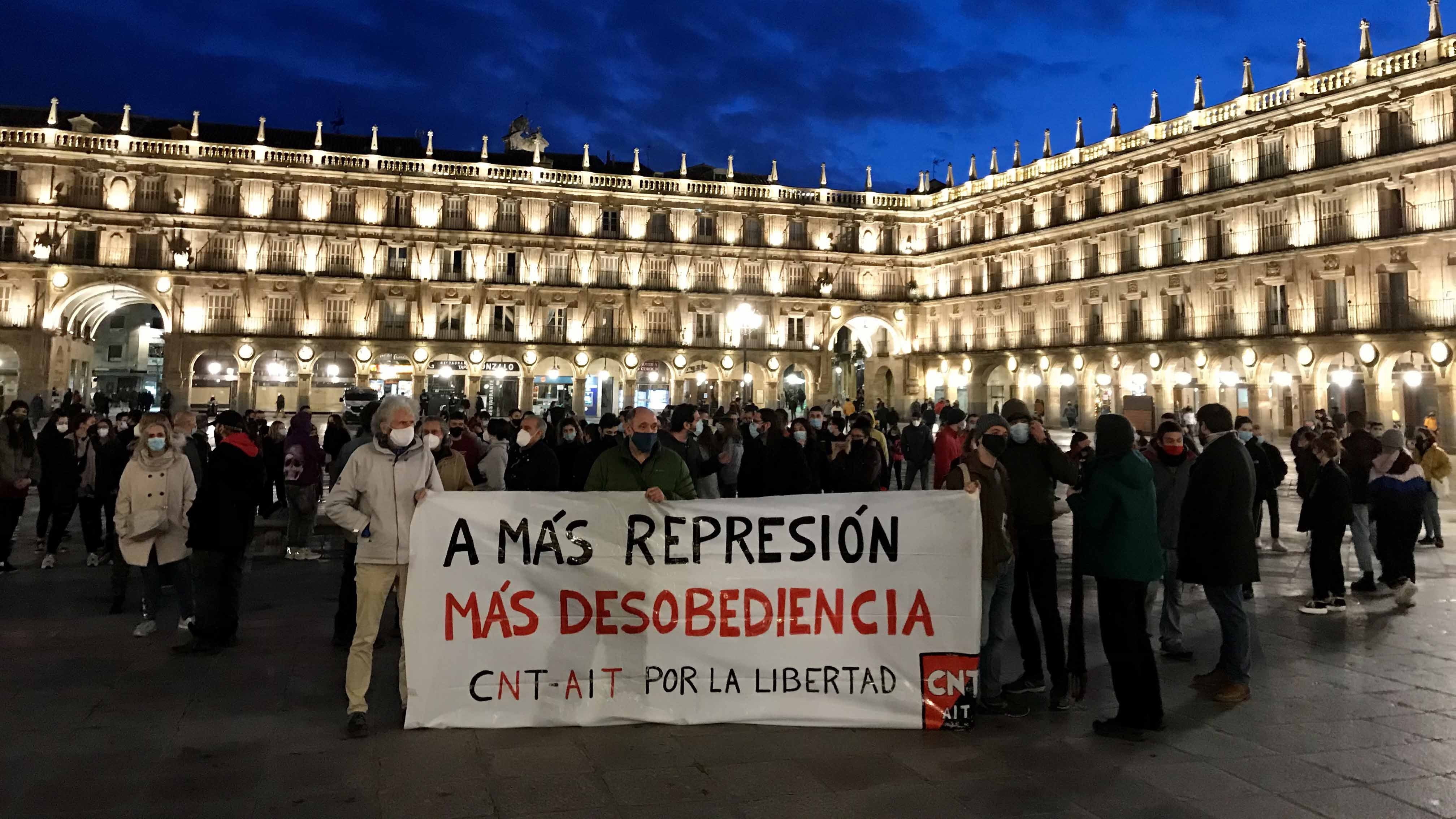 Dos pancartas presidieron la protesta, como cabecera, que rezaban 'A más represión, más desobediencia' y 'Frente al régimen y su represión, organización y poder popular'. Esta última, con el rostro del rapero encarcelado Pablo Hásel.