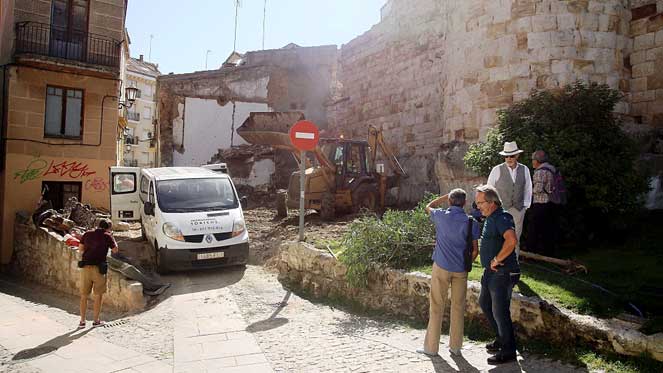 La Muralla de Zamora muestra otros 25 metros cuadrados de lienzo, después de que se derribasen dos inmuebles adosados al monumento en los números 9 y 11 de la calle Mesones, junto al Arco de Doña Urraca. Ese espacio se ajardinará en los próximos días, siguiendo la zona verde existente.