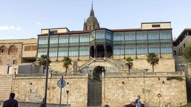 Con lo que suponía para la historia edificar en esa zona, se le sumó un desnivel, que Vargas resolvió con una escalera con la que creó terrazas ajardinadas y una gruta cubierta de rocalla. Construido en torno a un patio interior y con el hierro y el vidrio como protagonistas, Casa Lis reserva una sorpresa, ya que su fachada norte “es uno de los pocos ejemplos modernistas de la ciudad salmantina”. Hecha de piedra y ladrillo, destaca su puerta de acceso y la decoración, con vidrieras artísticas en la galería del patio, las puertas y la claraboya de la escalera principal.