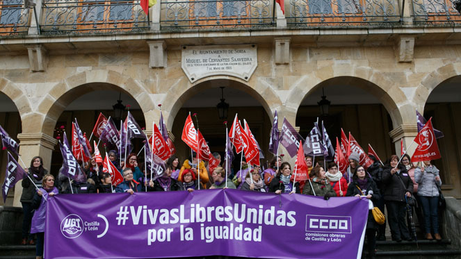 Además, las 12.00 horas los sindicatos UGT y CCOO se concentraron en la plaza Mayor de Soria para iniciar la jornada reivindicativa contra la brecha salarial, el acoso laboral y sexual y la violencia de género. Unas 400 personas secundaron el llamamiento de los sindicatos que pedían el paro de la jornada laboral durante dos horas por turno.