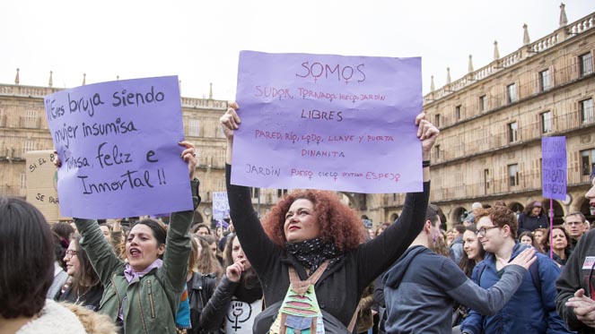 Las calles del centro de Salamanca se llenaron, a lo largo de la mañana, de más de 3.000 personas, según fuentes policiales, que convocadas por diversos sindicatos y por el colectivo Movimiento Feminista, clamaron por la igualdad salarial y real entre mujeres y hombres y por el fin de la violencia machista.