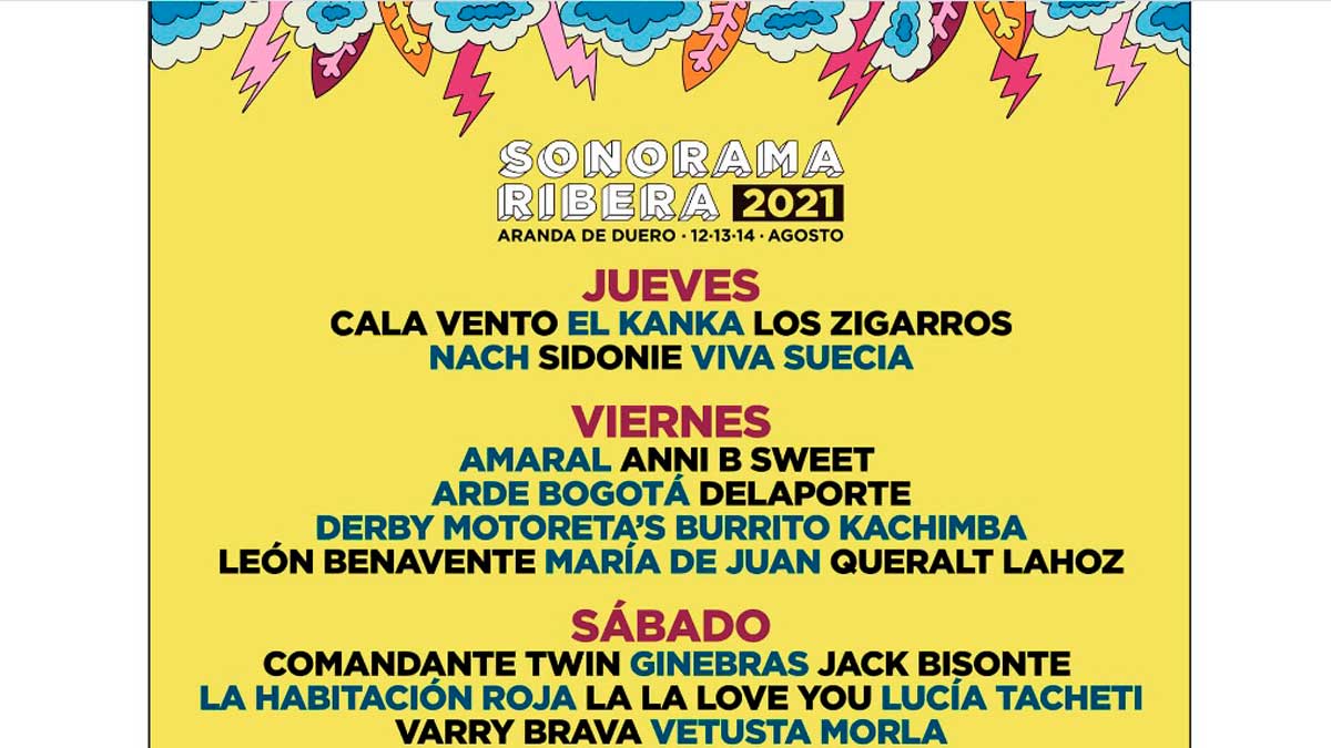 'Sonorama Ribera' vuelve los días 12, 13 y 14 de agosto a Aranda de Duero, Burgos, tras el parón del pasado año a consecuencia de la pandemia provocada por la COVID-19, y contará en el cartel con artistas y grupos como Sidonie, León Benavente, La Habitación Roja, Vetusta Morla y Amaral, además de que se ha establecido un límite de aforo de 5.000 personas de pie y con mascarilla.