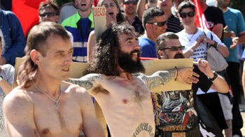 Varios trabajadores de la fábrica de IVECO en Valladolid se desnudaron y crucificaron simbólicamente este miércoles, ante las puertas de la factoría y respaldados por otros compañeros, en protesta por los once despedidos por la compañía este mes y bajo el lema ‘Estamos desnudos ante las injusticias laborales; somos mártires de la avaricia empresarial”.